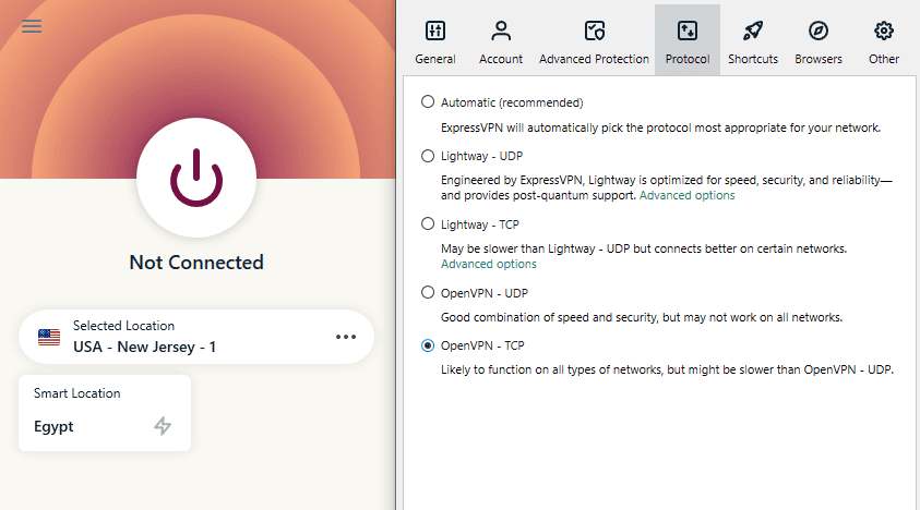 ExpressVPN offers a kill switch, which cuts your internet connection if the VPN connection fails. This and DNS leak protection prevent accidental leaks that could reveal your identity or location. In addition, ExpressVPN offers the following VPN protocols: