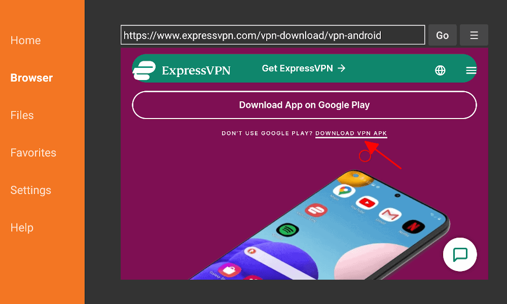 Type in the VPN service’s website URL and find the APK download button. It may help to find it on another device first.