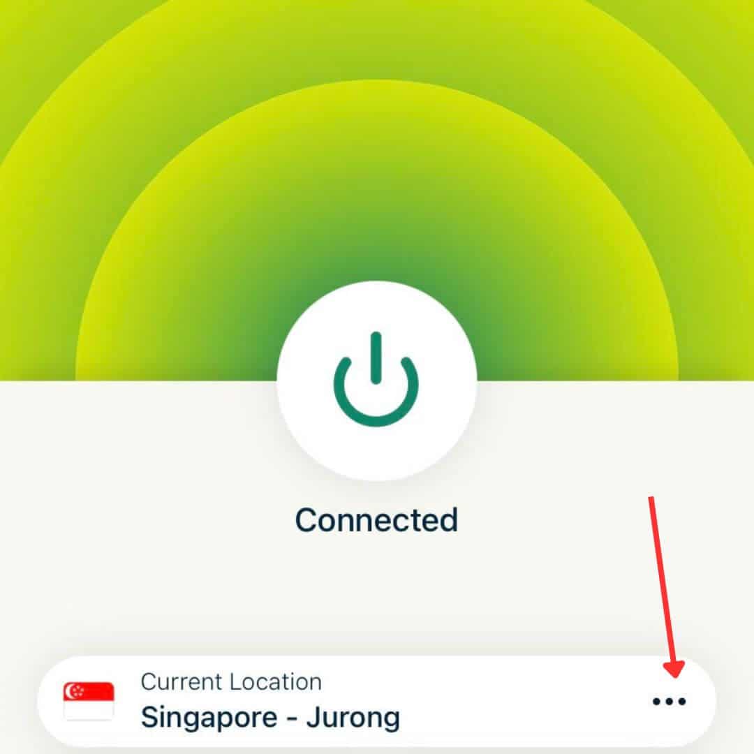 The next step is to sign in and find the best server for your needs (in this case, a Singapore server). Once you’ve signed in, ExpressVPN will detect your location. Click on the three dots to choose a new server location.