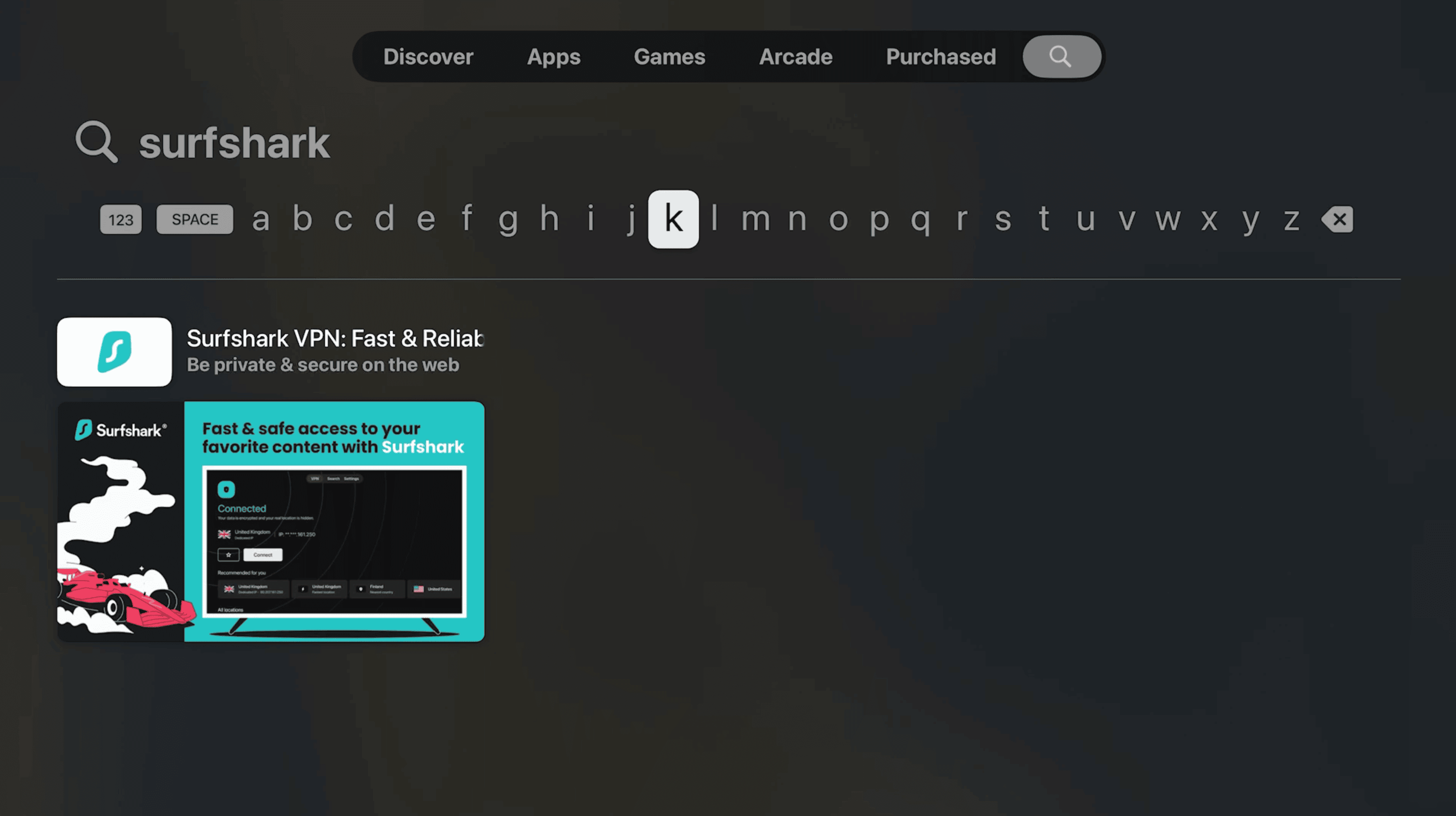 Open the App Store on your Apple TV and search for the VPN you want to download. In our case, we typed “surfshark” into the search bar. Click on the app, then follow the directions onscreen to download and install it on your smart TV.
