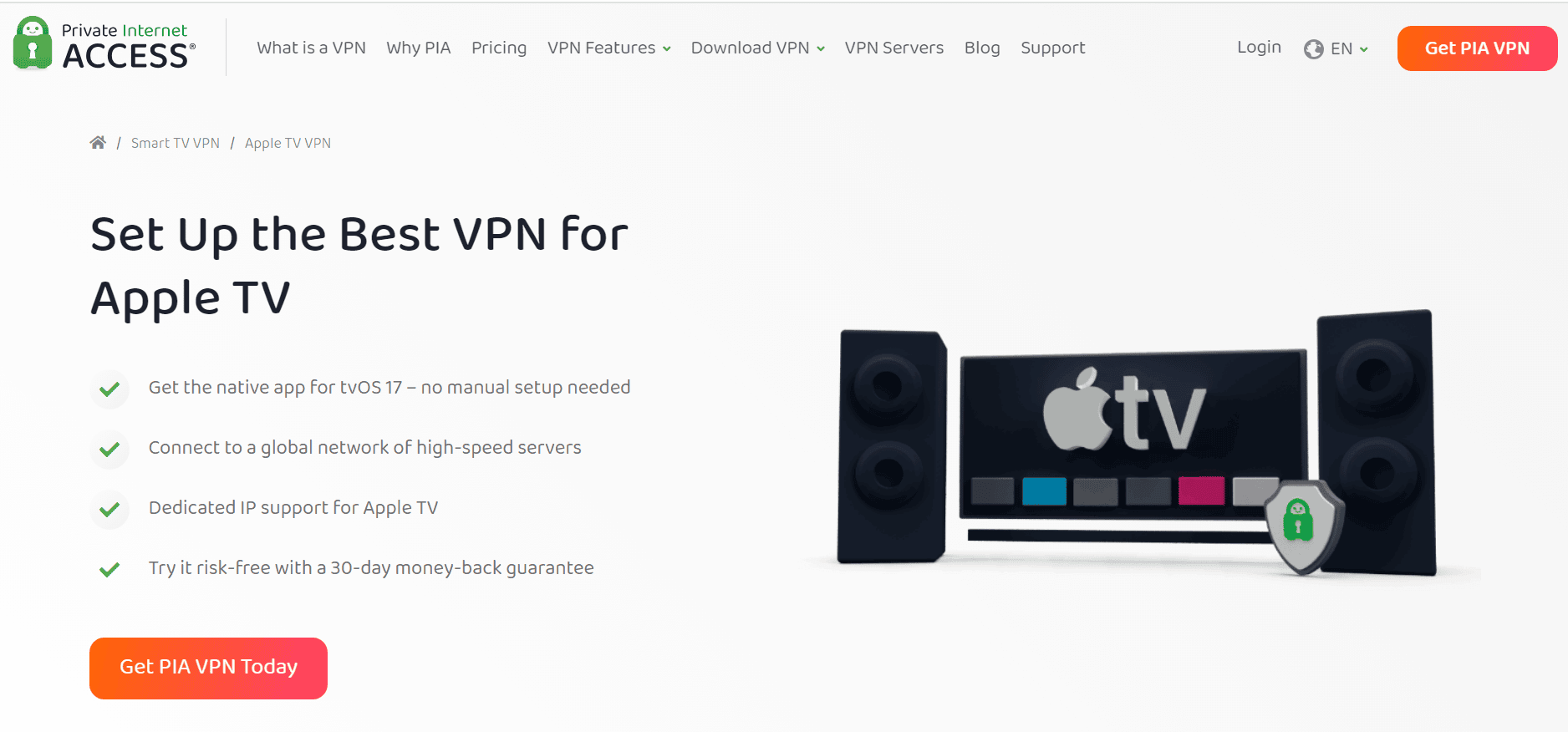 Surfshark is the best VPN for Apple TV streaming devices thanks to its easy-to-use Apple TV app, super-fast speeds, extensive server coverage and affordable pricing. Other excellent Apple TV alternatives are NordVPN, ExpressVPN, PIA and IPVanish. We’ve summarized the main features of these VPNs in the table below.
