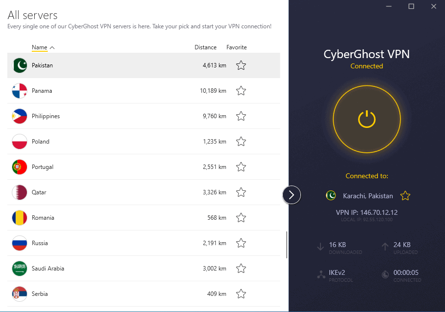 You can also use CyberGhost to get a Pakistani IP address. Unfortunately, its servers in Karachi aren’t the P2P-optimized ones, and it just isn’t as fast as ExpressVPN, which is why it comes in second on our list. You do get decent speeds and unlimited data, though, as well as excellent device compatibility. For more detailed info, check out our CyberGhost review.