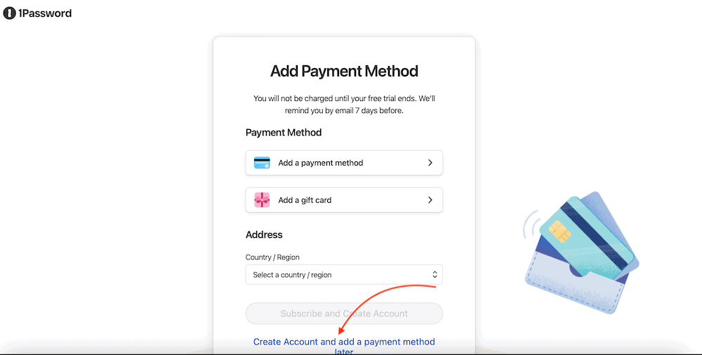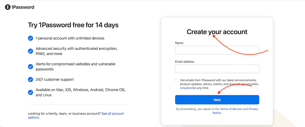 Go to 1Password’s website and choose the plan you want. You’ll be prompted to create an account using your email address and a password. Then, click “next.”