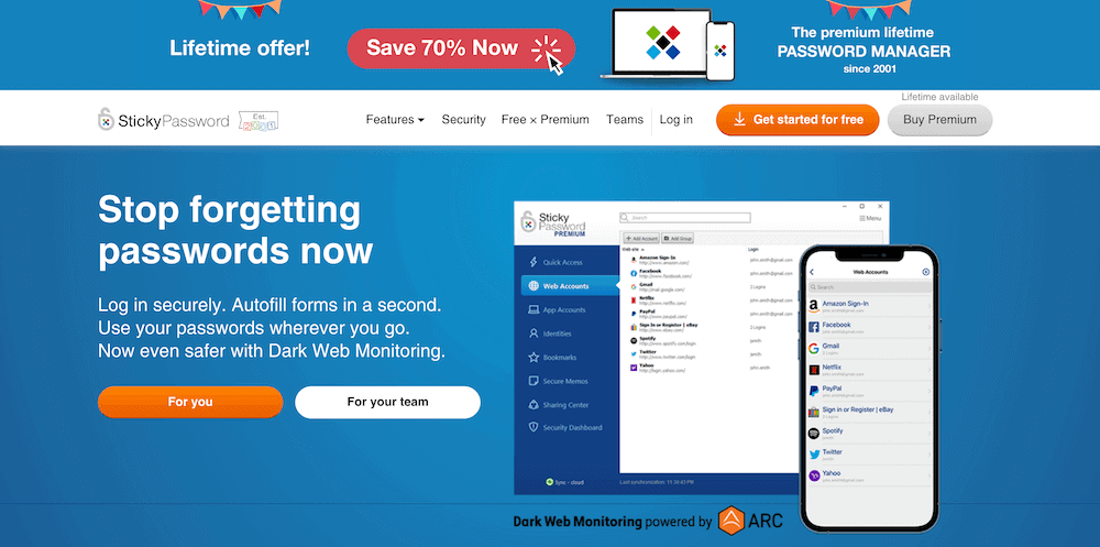 With Sticky Password, you can save unlimited passwords, generate strong passwords and sync them across devices. It’s available on Chrome, Firefox, Edge, Opera, Android, Windows, iOS and macOS. We think it’s pretty cool that you can create a portable Windows copy of your vault, save it on an external drive and access it on any Windows device.