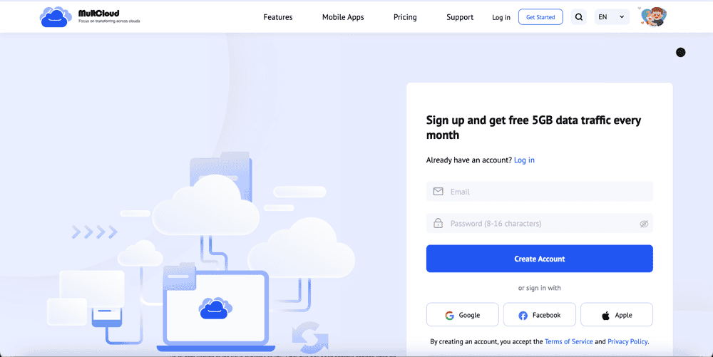 Sign up for a free MultCloud account. You only need an email address and a password.