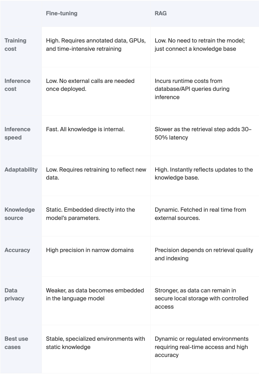 Fine-tuning involves modifying the model itself by retraining it on domain-specific data. It can produce strong results but is resource-intensive and inflexible. And after retraining, models yet again become static. RAG, on the other hand, keeps the model architecture intact and augments it with external knowledge, enabling dynamic updates and easier scalability.