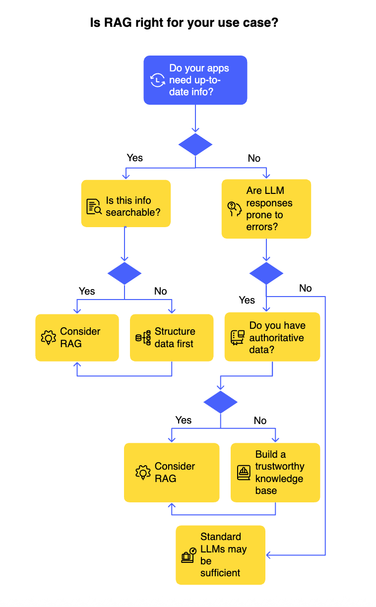 Still unsure if RAG is right for you? This simple chart will help determine whether standard LLMs meet your needs or if RAG’s enhanced capabilities are the better fit.